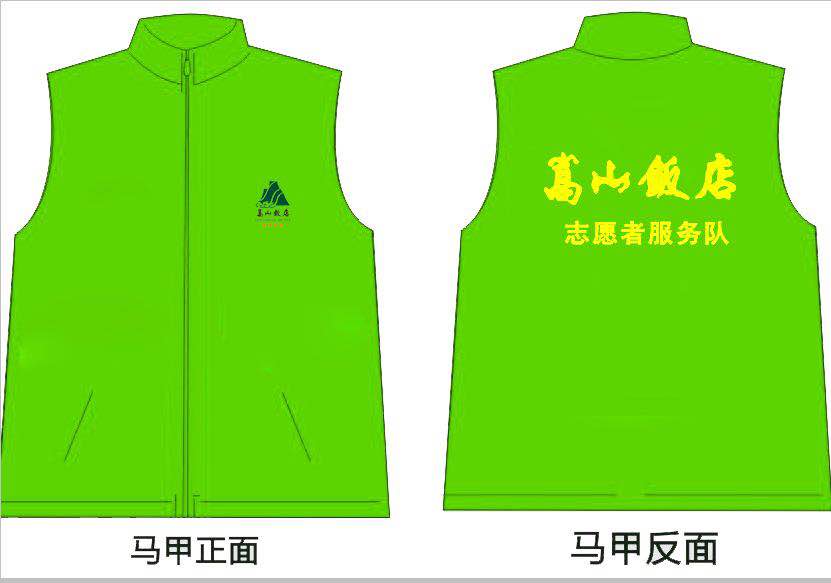 買馬甲直接來工廠,全國招代理:13592589975 嵩山飯店定制熒光綠色馬甲 500套